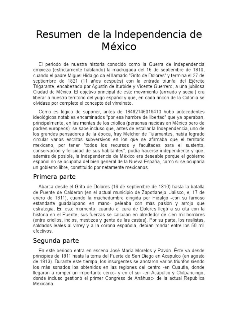 Independencia De México Resumen - Mexico : La madrugada del 16 de septiembre el cura miguel hidalgo convocó a los feligreses del pueblo de dolores, en el estado de guanajuato con el toque de una campana a levantarse en armas en contra del mal gobierno español.. El movimiento por la independencia de méxico se inicia la madrugada del 16 de septiembre de 1810 en dolores, guanajuato. Guadalupe victoria es el primer presidente de méxico; La independencia de méxico fue una lucha armada y una confrontación de ideas. Liberales y conservadores dominaban el sistema político de méxico al nacer como nación, los conflictos del país respecto al sistema en el cual méxico debía de administrase fueron durante el siglo 19 del méxico independiente, motivo por el cual la nación vivía en constantes luchas internas, que afectaban en lo económico y en lo social el desarrollo estable de méxico como pueblo. Esto, para separarse del poder de la corona española y todas las injusticias que esta infringía a todos los habitantes del perú.